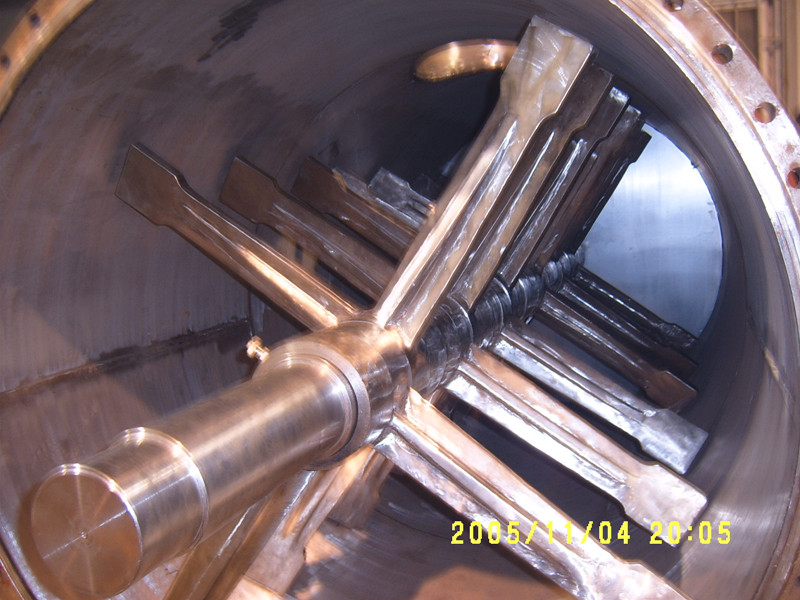 本機是一種新穎臥式間歇式真空干燥設備,濕物料經傳導蒸發,帶有刮板攪拌器不斷清除熱面上的物料,并在容器內推移形成循環流,水份蒸發后由真空泵抽出。