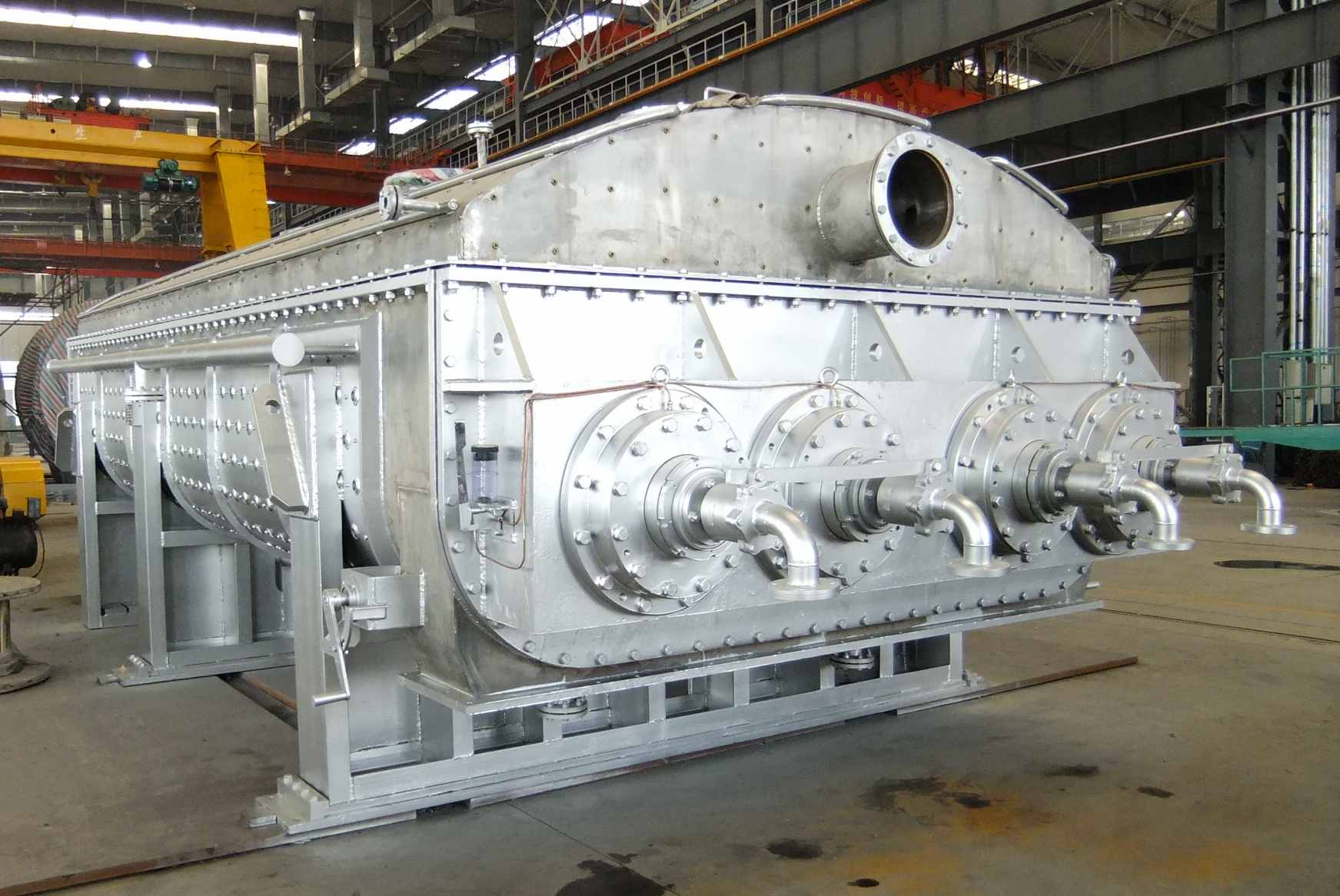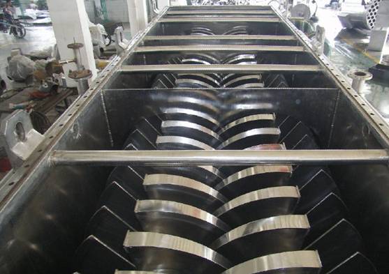 槳葉干燥設(shè)備經(jīng)互相嚙合的二到四根槳葉軸、帶有夾套的W形殼體、機(jī)座以及傳動部分組成,物料的整個(gè)干燥流程在封閉狀態(tài)下進(jìn)行,有機(jī)揮發(fā)氣體及異味氣體在密閉氛圍下送至尾氣處理裝置,避免環(huán)境污染。